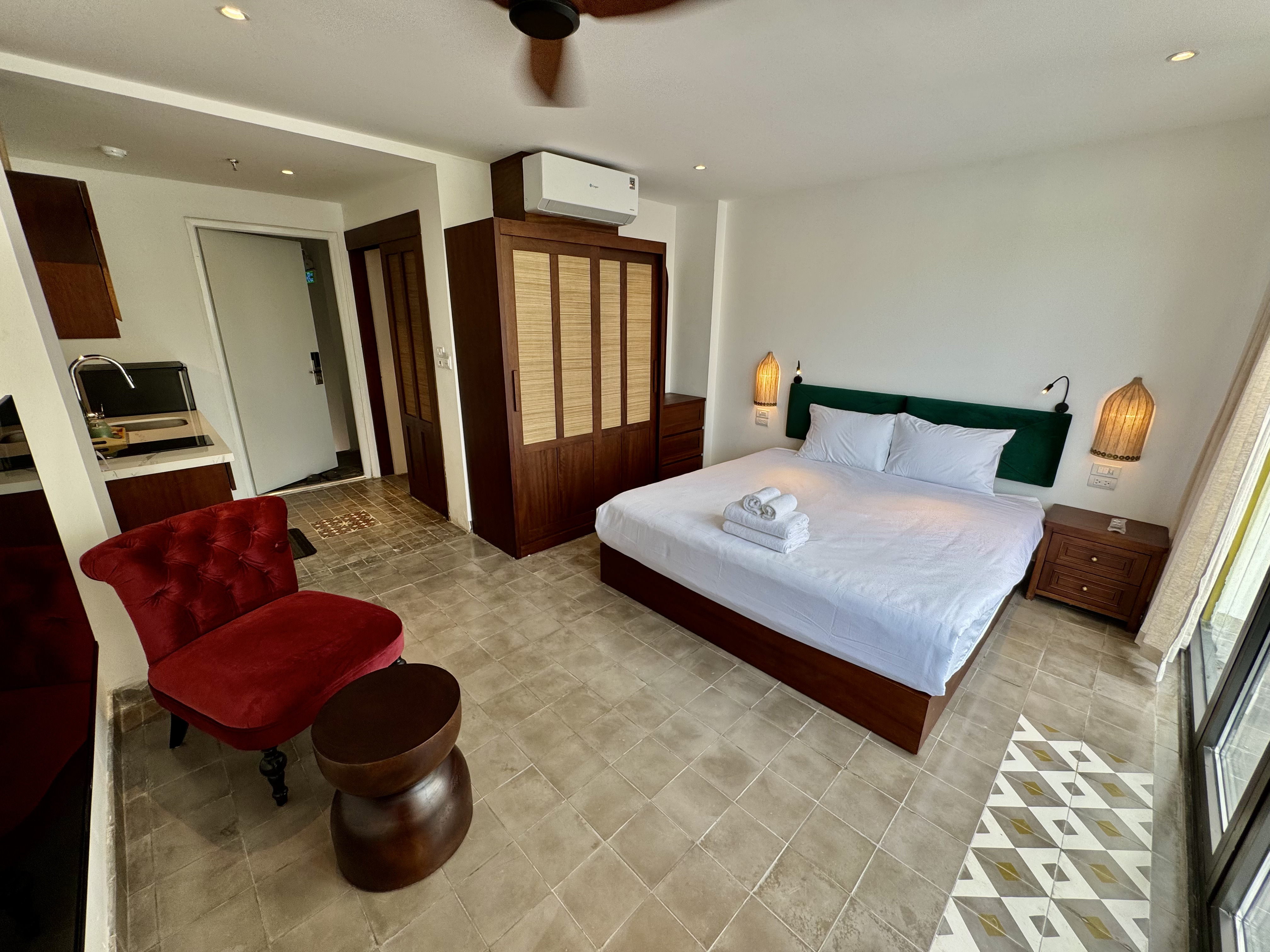 Well equipped with sofa and chairs, all necessary cooking appliances, living room, kitchen and dining room are the same space.
